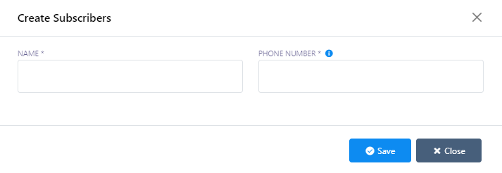 • A modal form called `Create Subscribers` will appear with two fields: `Name` and `Phone Number`.